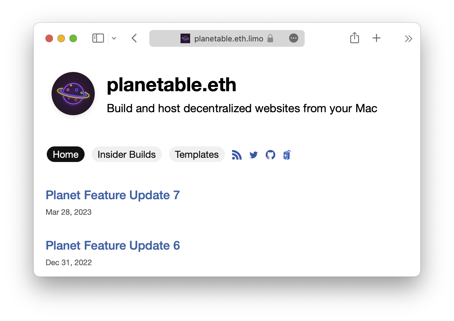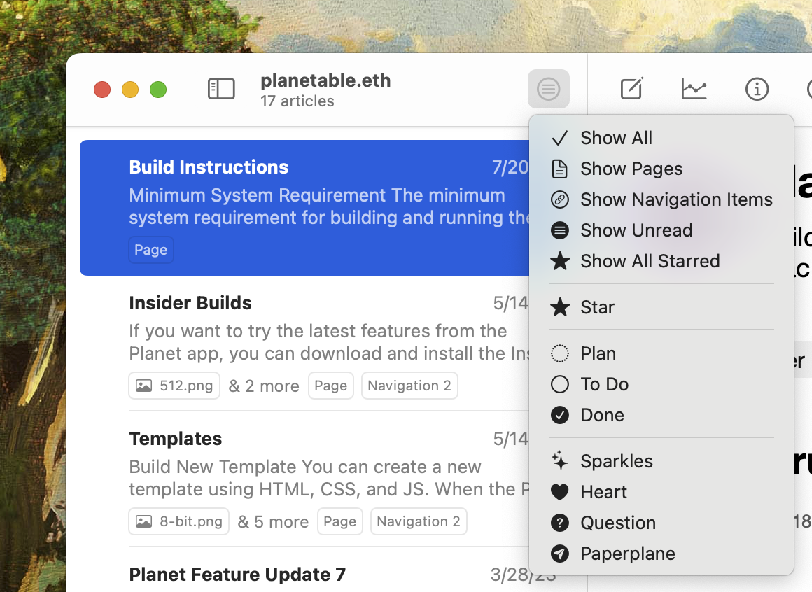 通过这些新设置,你可以获得类似 planetable.eth 顶部这样的网站导航设计。这可以通过指定某些文章作为网站导航栏中的条目来实现。