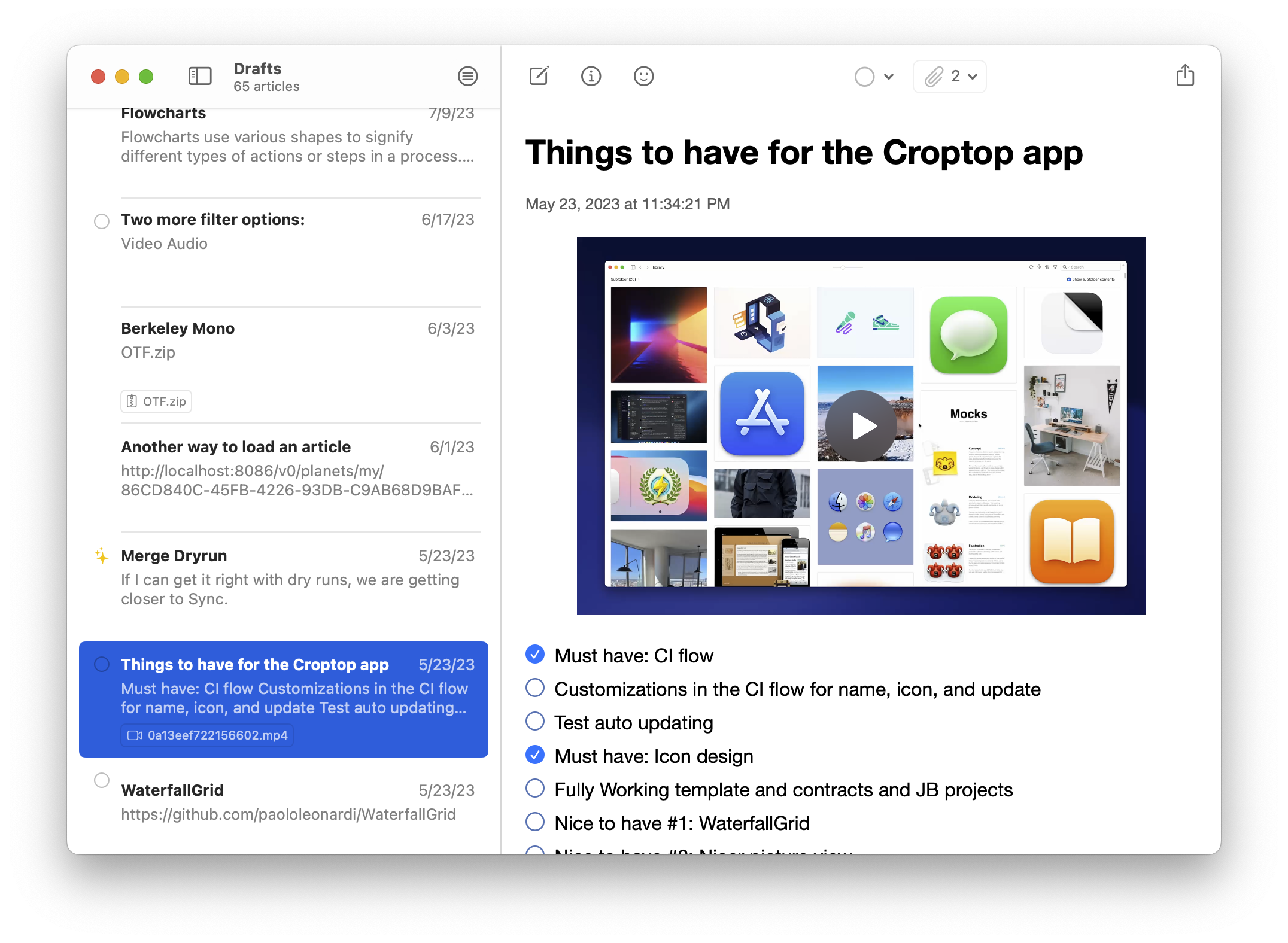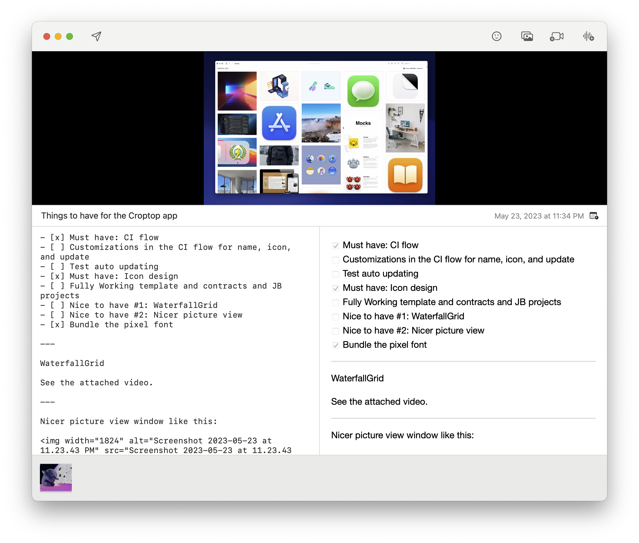 Planet 的 Markdown 编辑器现在也可以支持类似 GitHub 的 To-Do 语法。并且在 My Planet 的右侧视图中,可以直接点击 To-Do 列表中的项目来勾上已经完成的事项。